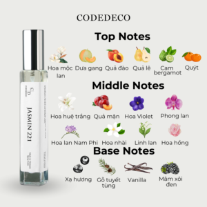 Hương giữa: Hoa Huệ Trắng, Quả Mận, Hoa Violet, Hoa Phong Lan, Hoa Lan Nam Phi, Hoa Nhài, Hoa Linh Lan, Hoa Hồng