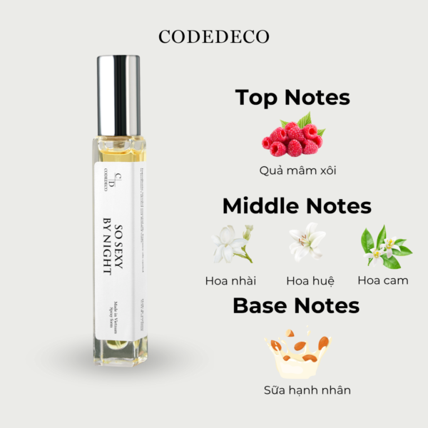Tinh dầu nước hoa CODEDECO So Sexy By Night có thành phần nốt hương sữa hạnh nhân kết hợp với quả mâm xôi, hoa nhài, hoa huệ và hoa cam ngọt ngào, béo ngậy nhưng vẫn tươi trẻ, sự kết hợp giữa các nốt hương trái cây và hoa cỏ với hương sữa tạo nên một mùi hương ngọt ngào, nữ tính và quyến rũ, thích hợp cho các dịp đặc biệt.